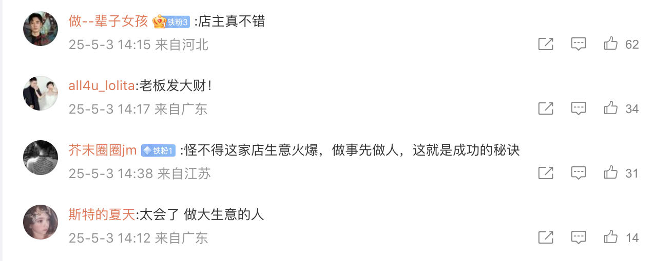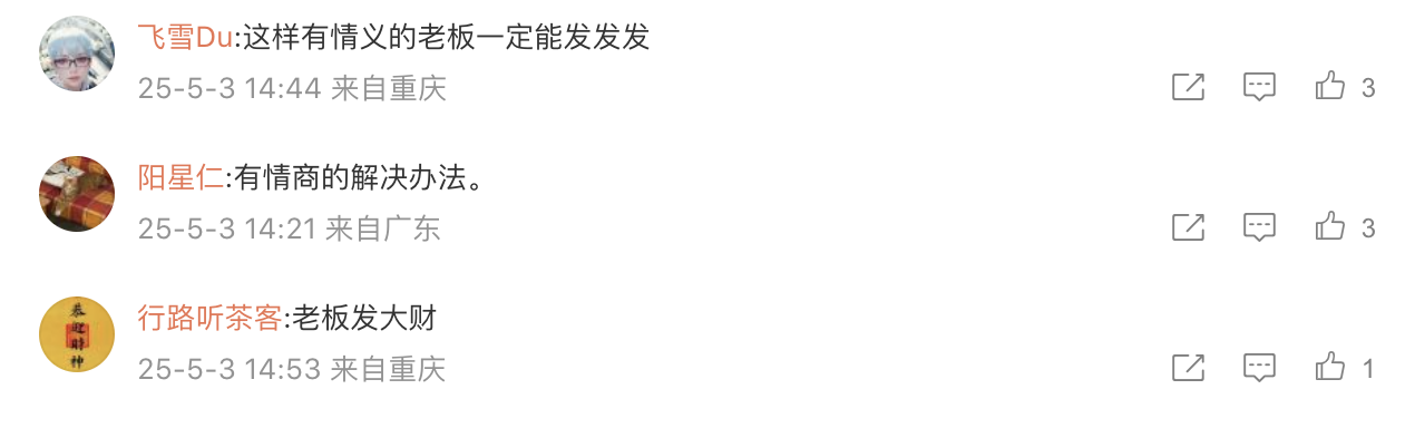 多位网友点赞店主的处理方式,称“这样有情义的老板一定能发发发”。