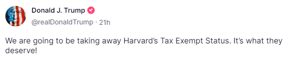 特朗普当天在社交媒体上写道:“我们将取消哈佛大学的免税地位,这是他们应得的!”