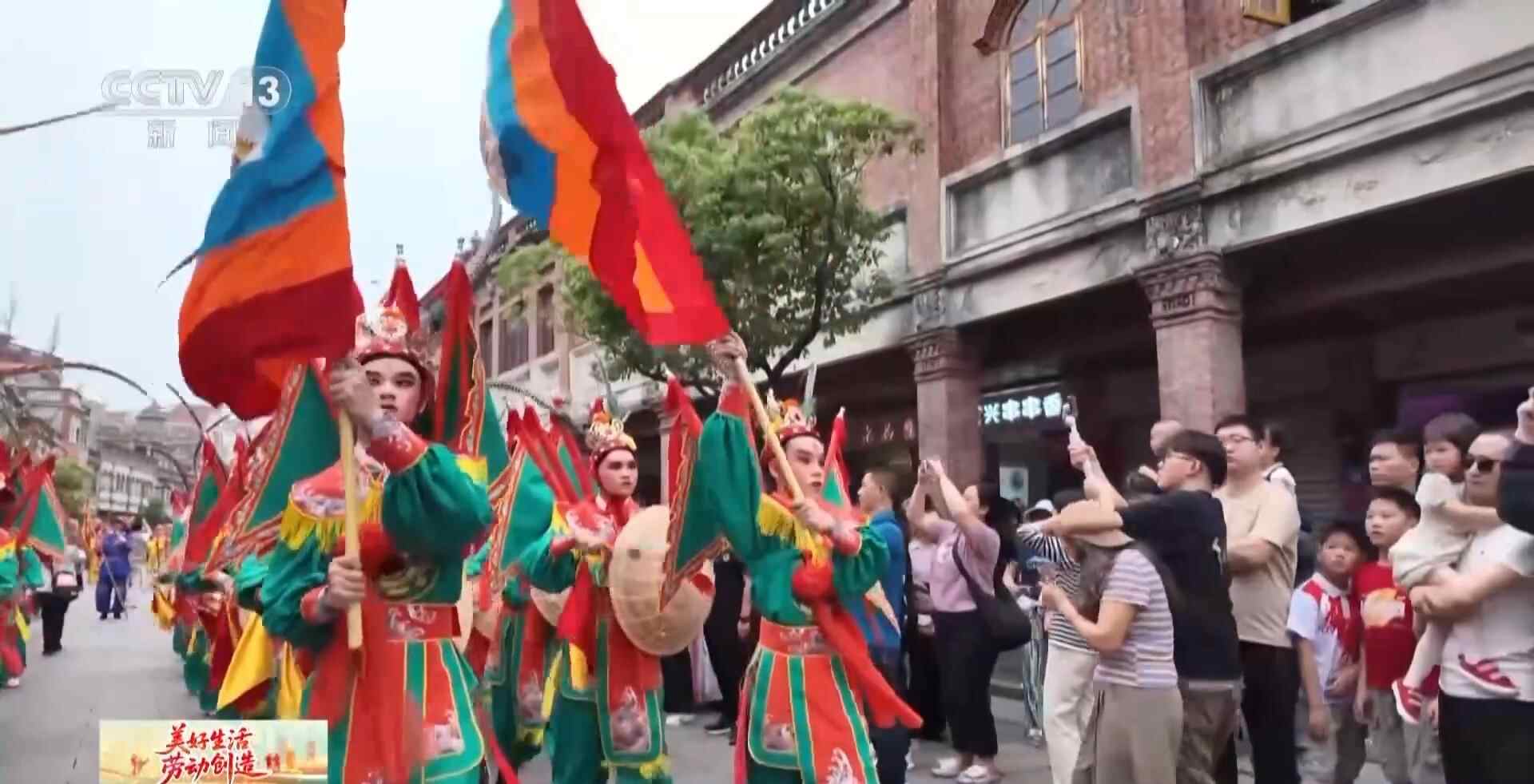 “五一”期间,非遗体验遍布泉州古城,比如在游客必到的中山路,游客就可以偶遇青狮、火鼎公婆等非遗快闪。