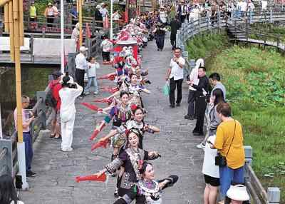 在湖南怀化的景区里,游客观看民族服饰表演。