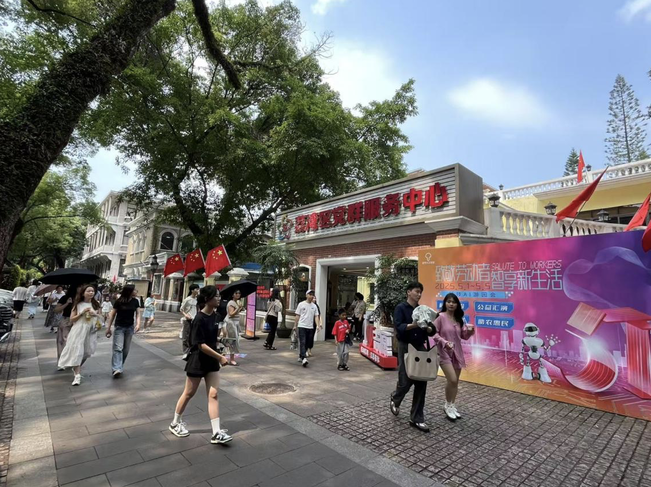在“五一”假期,广州荔湾区党群服务中心红旗广场化身科技乐园,以“致敬劳动者,智享新生活”为主题的AI游园会持续举办至5月5日。这场由荔湾区党群服务中心联合多个“阵地合伙人”共同打造的活动,采用“政府搭台、企业参与、科技赋能”的服务模式,开启党群服务的“智”变之路。