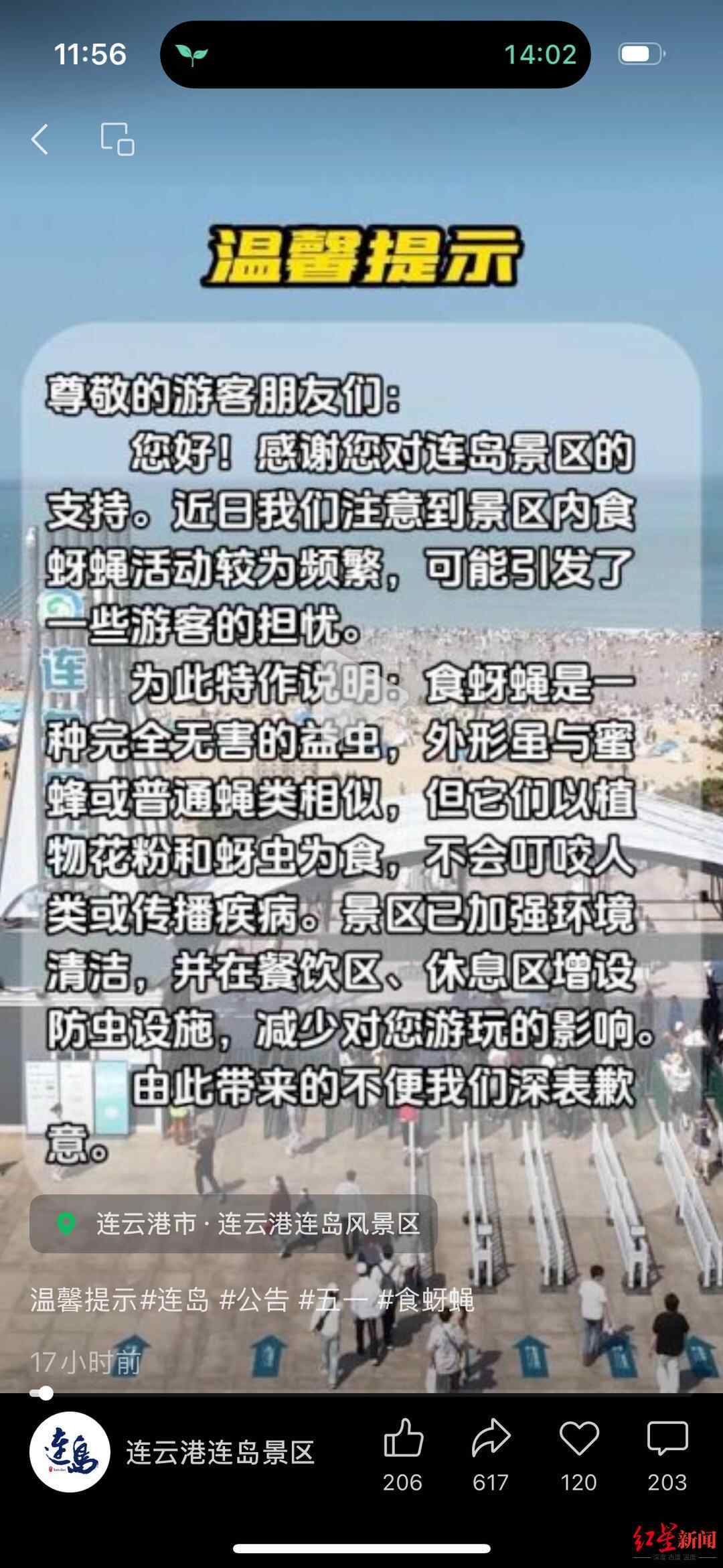 5月3日,连岛风景区工作人员告诉红星新闻记者,食蚜蝇是益虫,对人的身体无害,目前景区已进行全面消杀。其解释,往年连岛景区并未出现过此类现象,5月2日,食蚜蝇大量出现,经过消杀后,目前情况已有所好转。食蚜蝇大量出现的原因目前未知,可能与近日景区一带出现强对流天气有关。