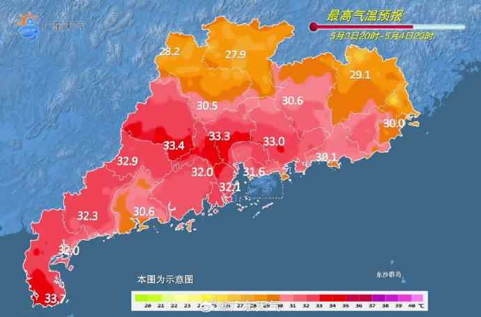 ◆5月4-5日,粤北市县有大雨局部暴雨,珠江三角洲有中到大雨局部暴雨,其余市县有雷阵雨局部大雨,部分市县将伴有8~9级的雷雨大风。最高气温:粤北市县25~28℃,珠三角北部市县28~30℃,粤西市县32~34℃,其余市县29~31℃。