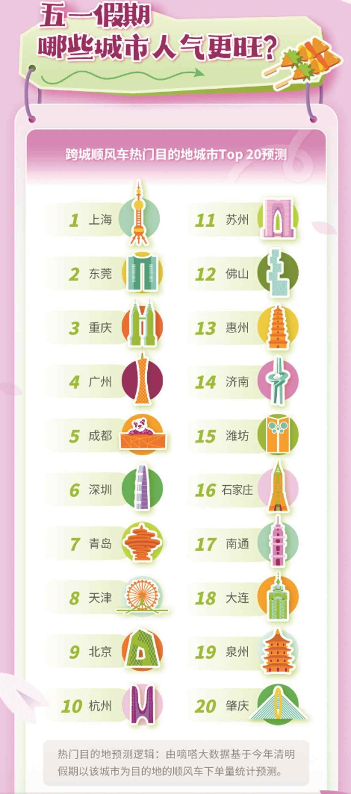 假期出游,游客们都喜欢去什么地方?从嘀嗒顺风车订单量的排名前20的城市来看,珠三角占据了6席,东莞、广州、深圳、佛山、惠州、肇庆等城市顺风车订单量最多。此外,长三角城市在前20名城市中占4席,京津冀和环渤海占4席,山东占3席。这也与顺风车下单增幅排名前十的景点相呼应,嘀嗒数据显示,“五一”顺风车下单增幅排名前10的景点中,八成位于一线/新一线城市的2小时交通圈内,且其中有一半景点下单增幅预计较平日增长500%以上,最高达超700%。