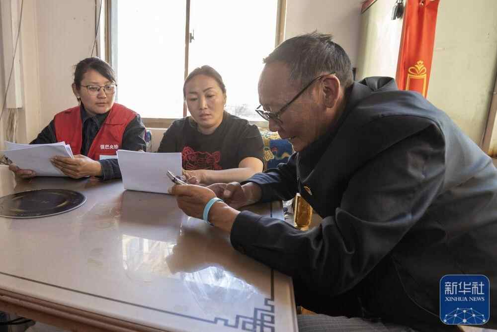 ↑ 尼玛在村里的基础建设提升工程现场指挥工作(4月24日摄)。