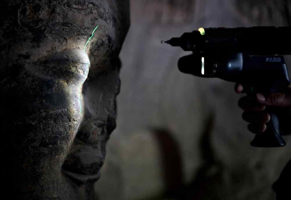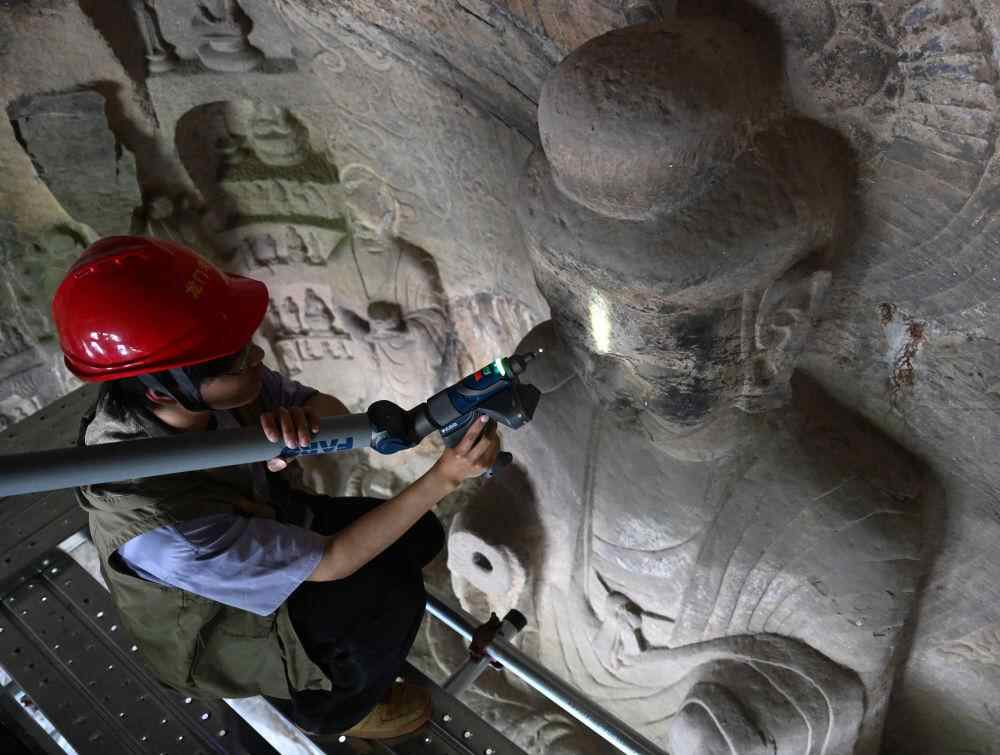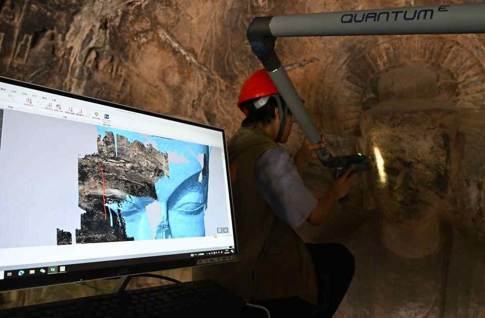 4月9日,龙门石窟研究院工作人员在魏字洞使用关节臂扫描仪对佛像进行数字化扫描。