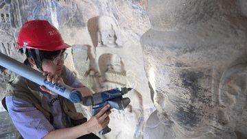 4月10日,龙门石窟研究院工作人员在万佛洞前查看数字化复原后的窟前南壁菩萨造像。