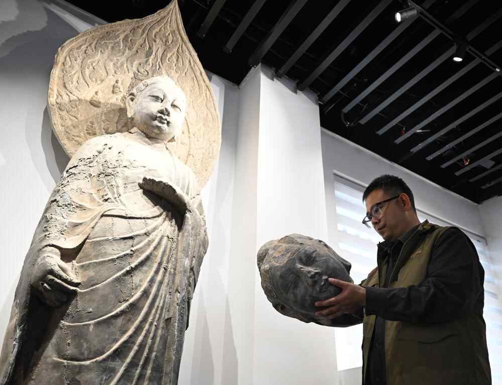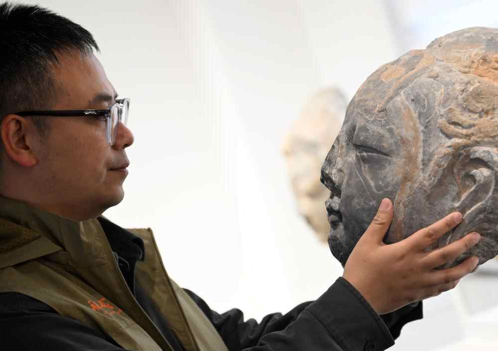 4月10日,龙门石窟研究院工作人员在查看3D打印佛首模型。