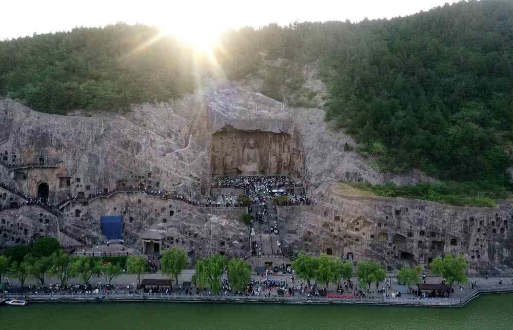 4月24日,游客在龙门石窟游玩(无人机照片)。