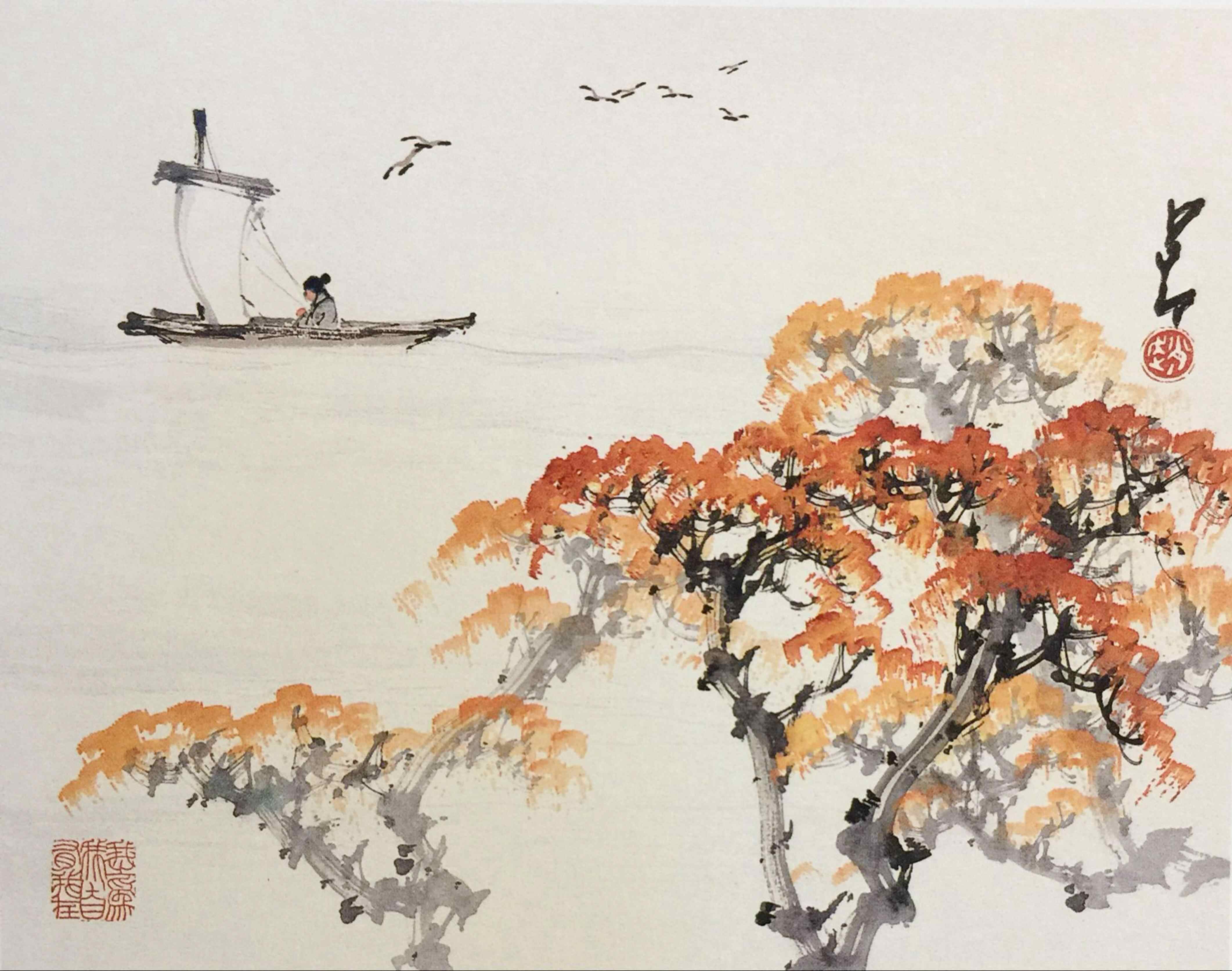 《秋帆图》《红叶归棹图》等都使用了较大面积的橘黄色调。赵少昂善于运用丰富多变的色彩来渲染环境气氛,画面色彩既有中国传统绘画的淡雅清新,又吸收了西方绘画的浓烈、热烈,自有一种独特的色彩语言。