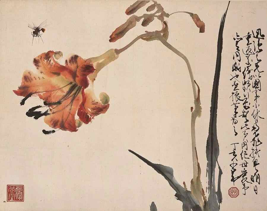 赵少昂画作《萱草》,用寥寥几笔,勾勒出一株向下微倾吐蕊的花与笔直的茎叶喷薄而出的生命力。画面上方还有一只展翅的昆虫,动静结合,肆意洒脱而不失细节,结构严谨而颇具韵致。