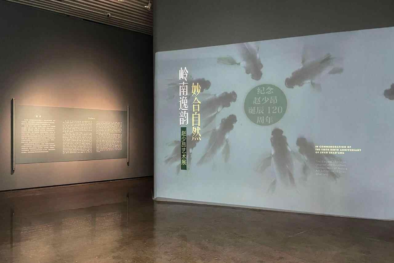 步入《岭南逸韵 妙合自然——赵少昂艺术展》展厅,一面青色为主色调的动态投影墙上,几抹淡墨绘成的游鱼从八方游来,这是以赵少昂作品《群鱼逐落花》为灵感构建的互动装置,寓意宾朋汇聚一堂,也暗示观众:您已置身岭南花鸟世界。