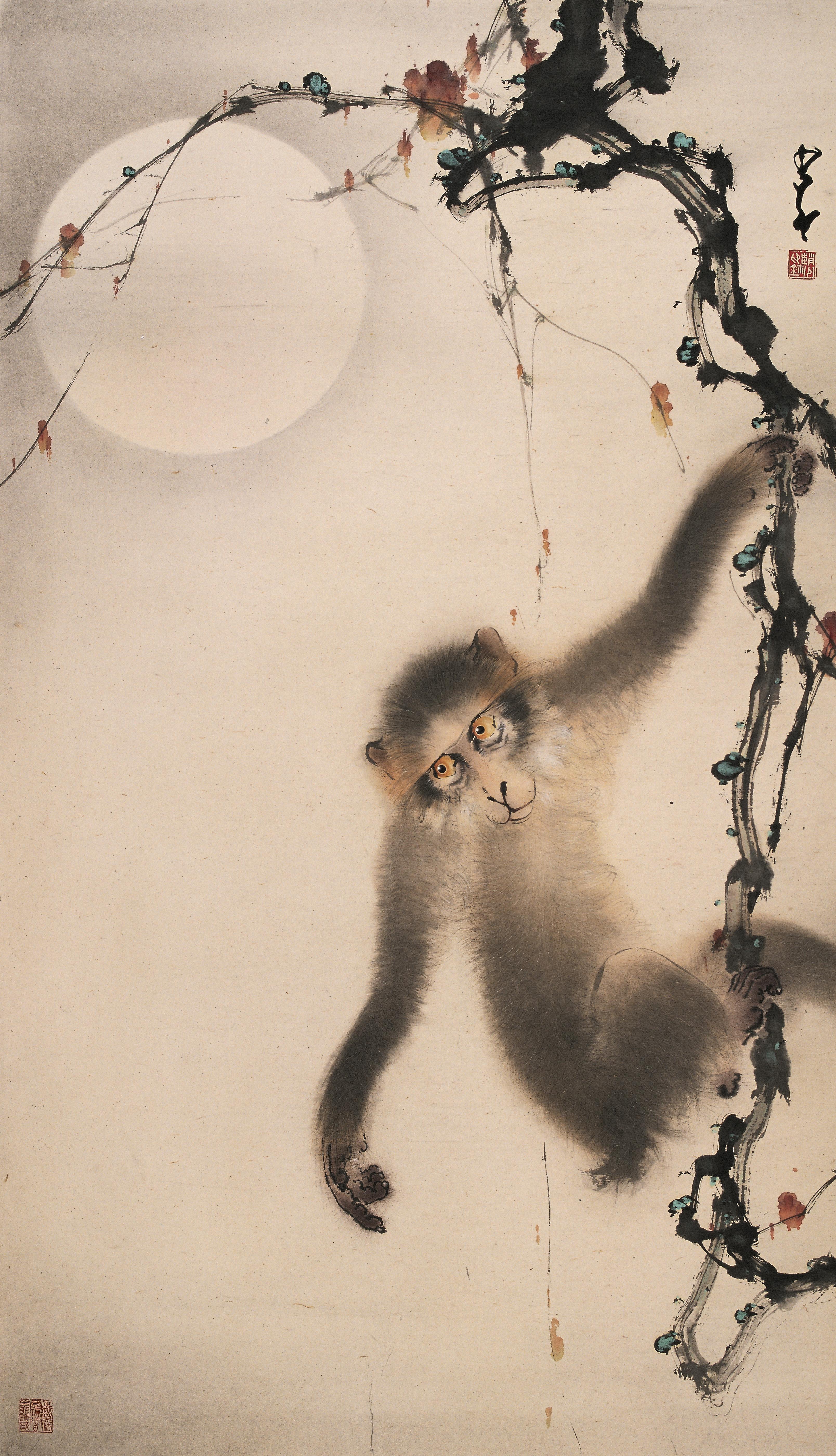 画作《白孔雀》中,孔雀羽毛的幻彩变化和轻柔纤细的质感呼之欲出,尽显其高超的写实造型能力和工笔技法;画作《月夜猿啼》中,一轮圆月高悬,一只猿猴单手攀藤,整个画面在静谧中透出生机。