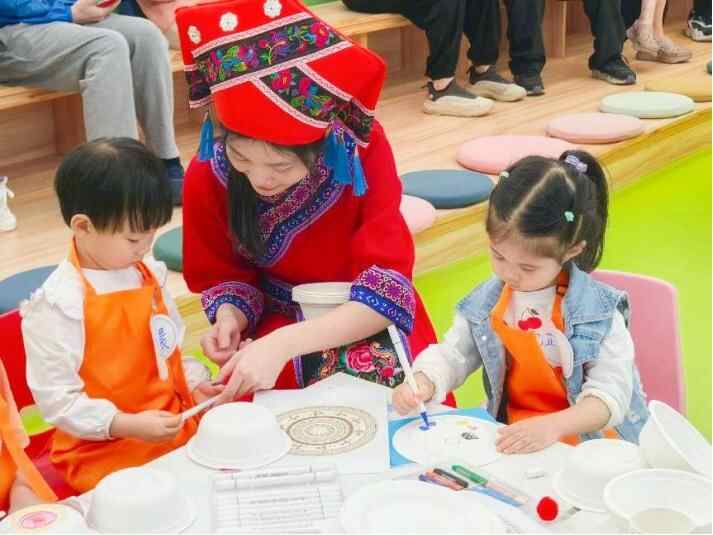 与此同时,在广图南二楼亲子绘本阅读馆,志愿者彩虹老师化身文化传承人,与孩子们共读绘本《灯笼山》。绘本故事将剪纸艺术与广西花山岩画充分结合,讲述壮族少年桂娃勇斗水怪,守护家园的故事。故事结束后,彩虹老师和现场小读者一起制作铜鼓花纹手工艺品,带领孩子们了解广西壮族文化,直观感受壮族非遗技艺。