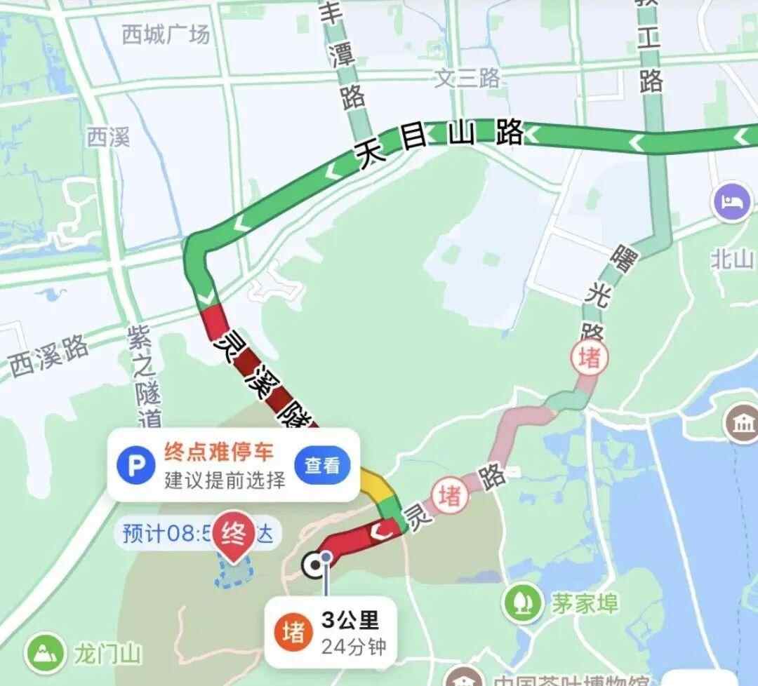 5月1日清早,就有网友称,杭州灵隐寺已经很热闹了。早上8点不到,手机地图软件显示,进出景区的灵溪隧道、灵隐支路已经堵成了红色,页面还发出了“终点难停车”的提醒。