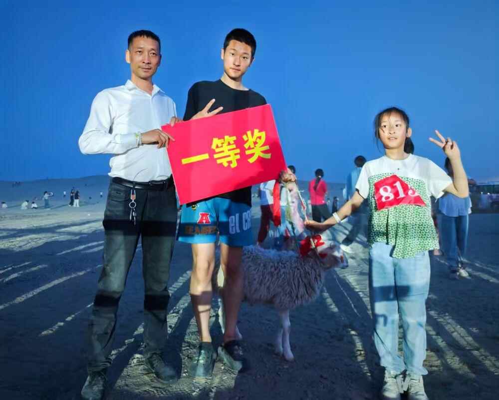 这是5月1日洛浦县玉龙湾沙漠乐园“大手拉小手”亲子徒步比赛家庭组一等奖获得者哥哥李一铭与妹妹李钰莹在领取奖品一只羊后与父亲的合照。