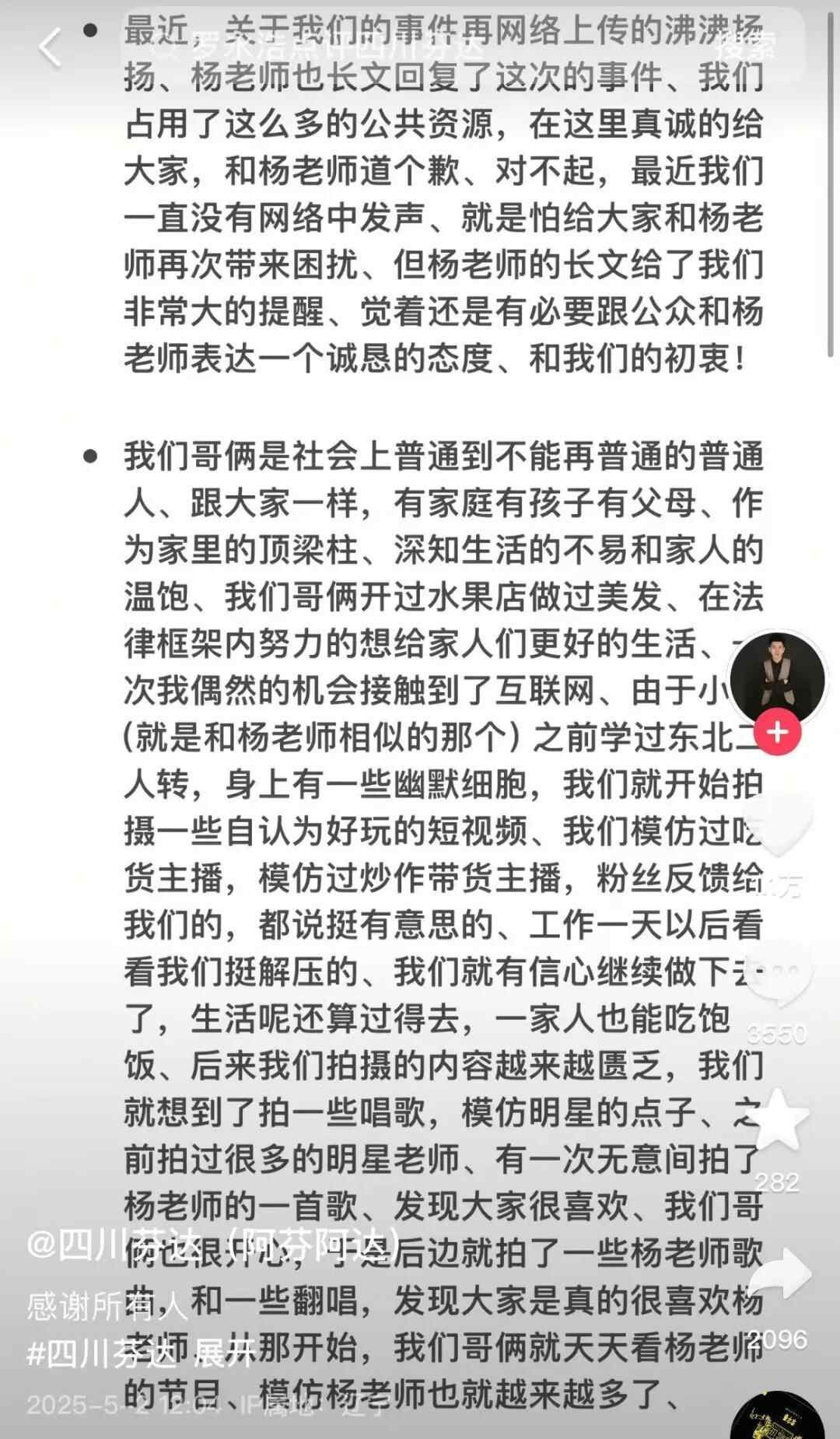 5月2日,被杨坤起诉的网红“四川芬达”发布声明,再次向杨坤道歉,“我们哥俩不是网络施暴者,我们只是您的模仿者而已,从来没有诋毁过您,内心是非常尊重您的”。