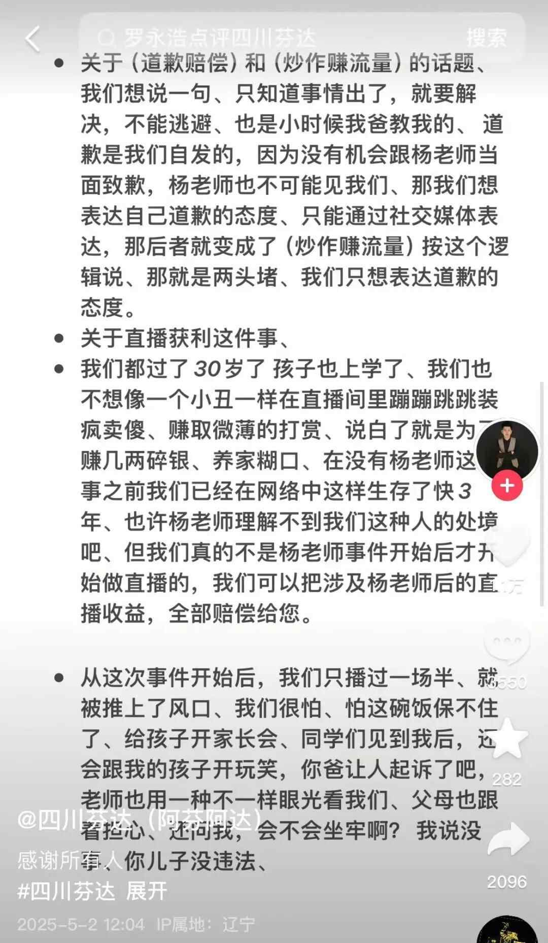 “四川芬达”求和解称,可以把涉及杨老师后的直播收益全部赔偿给对方,“不是我们不敢承担结果,是真的不想让您因为我们这样的小人物去生大气,犯不上浪费时间,也奢求杨老师也给我们小哥俩留一口饭吃”。