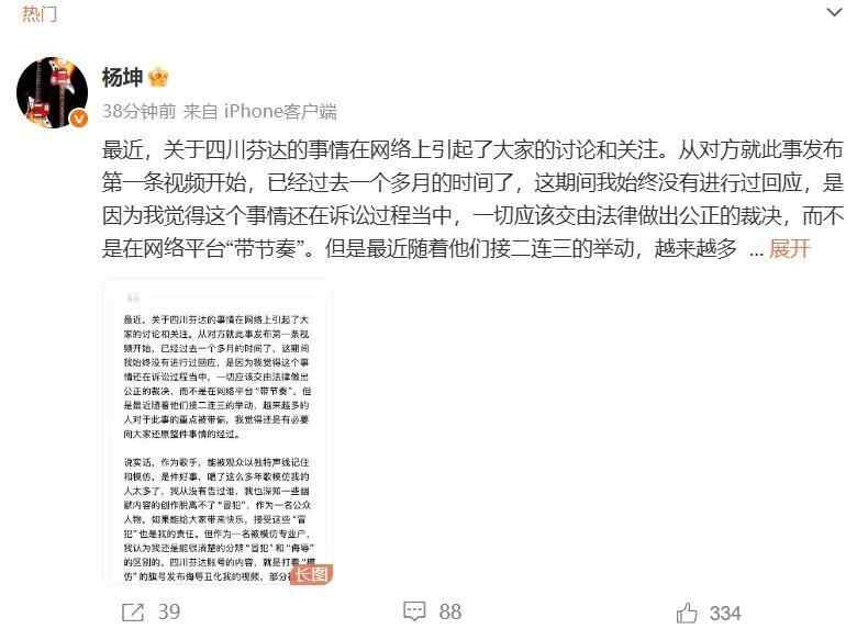 4月24日,杨坤在社媒发布长文回应“四川芬达”网络侵权纠纷事件,直言不会撤诉。