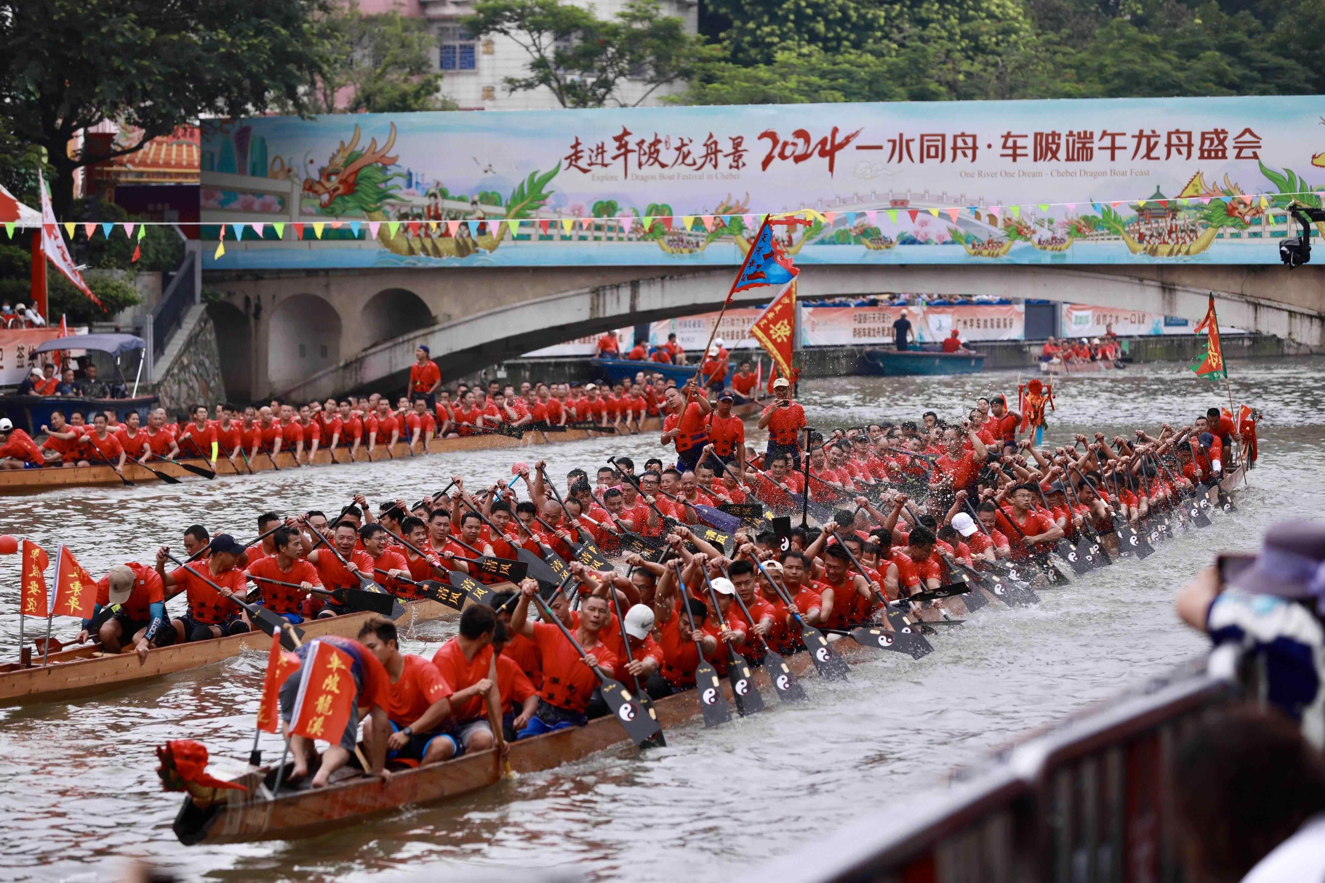 车陂村龙舟,据史料记载至少已有150年的历史,是广府龙舟文化的典型代表。车陂村传承至今的“扒龙舟”项目2017年被正式列为广州市非物质文化遗产,2022年,“车陂龙舟景”被列为广东省非物质文化遗产代表性项目。车陂龙舟赛素有“小广州赛”的美誉,云集了车陂村内外乃至珠江三角地区的龙舟运动选手参赛,兼具竞技性和观赏性。每年五月初三,过百艘龙船汇聚车陂,一河两岸人声鼎沸。