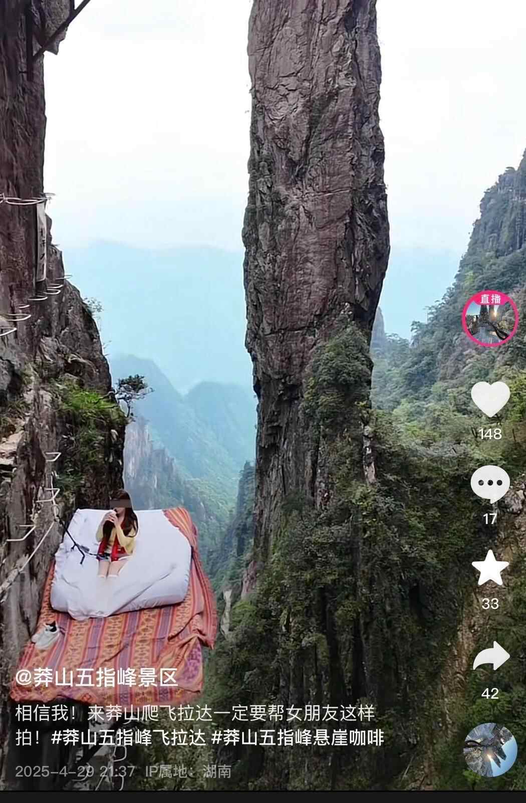 今年“五一”假期期间,湖南郴州莽山五指峰景区推出的“海拔1600米悬崖睡床”引发关注。