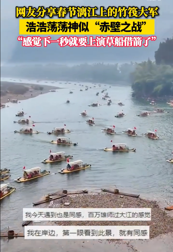 记者发现,今年2月4日,一段春节漓江竹筏盛景的视频在网络上迅速走红。视频中,数百只竹筏在碧波荡漾的漓江上浩浩荡荡地前行,当时就让不少网友联想到赤壁之战。