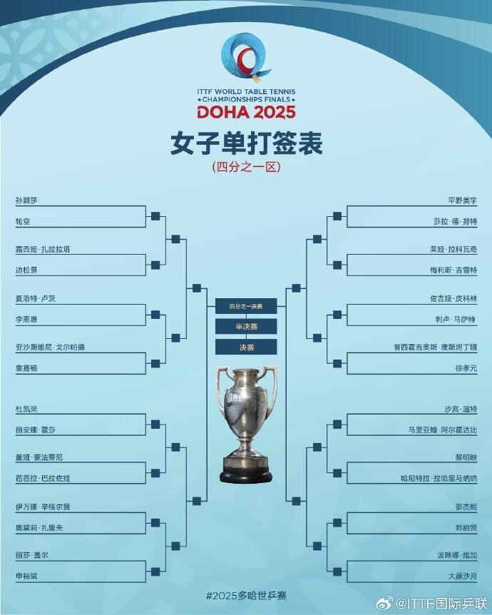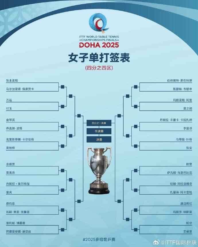 北京时间4月30日晚,2025年多哈世界乒乓球锦标赛举行了抽签仪式。女单方面,“中日对决”是主旋律,头号种子孙颖莎与大藤沙月在同一1/4区,王曼昱又碰到了张本美和。男单方面,林诗栋和梁靖崑同在1/4区,王楚钦和林高远同区。