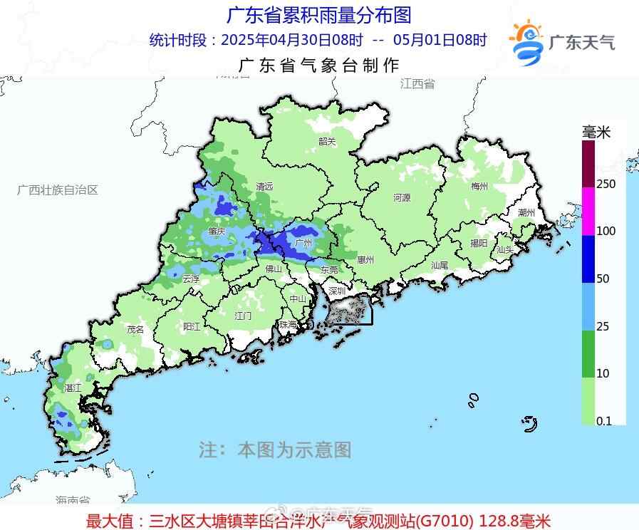 据气象水文监测,4月30日08时到5月01日08时,广东全省平均雨量7.1毫米,有3个镇街录得超过100毫米的大暴雨,有94个镇街录得50毫米~100毫米的暴雨,有130个镇街录得25毫米~50毫米的大雨。