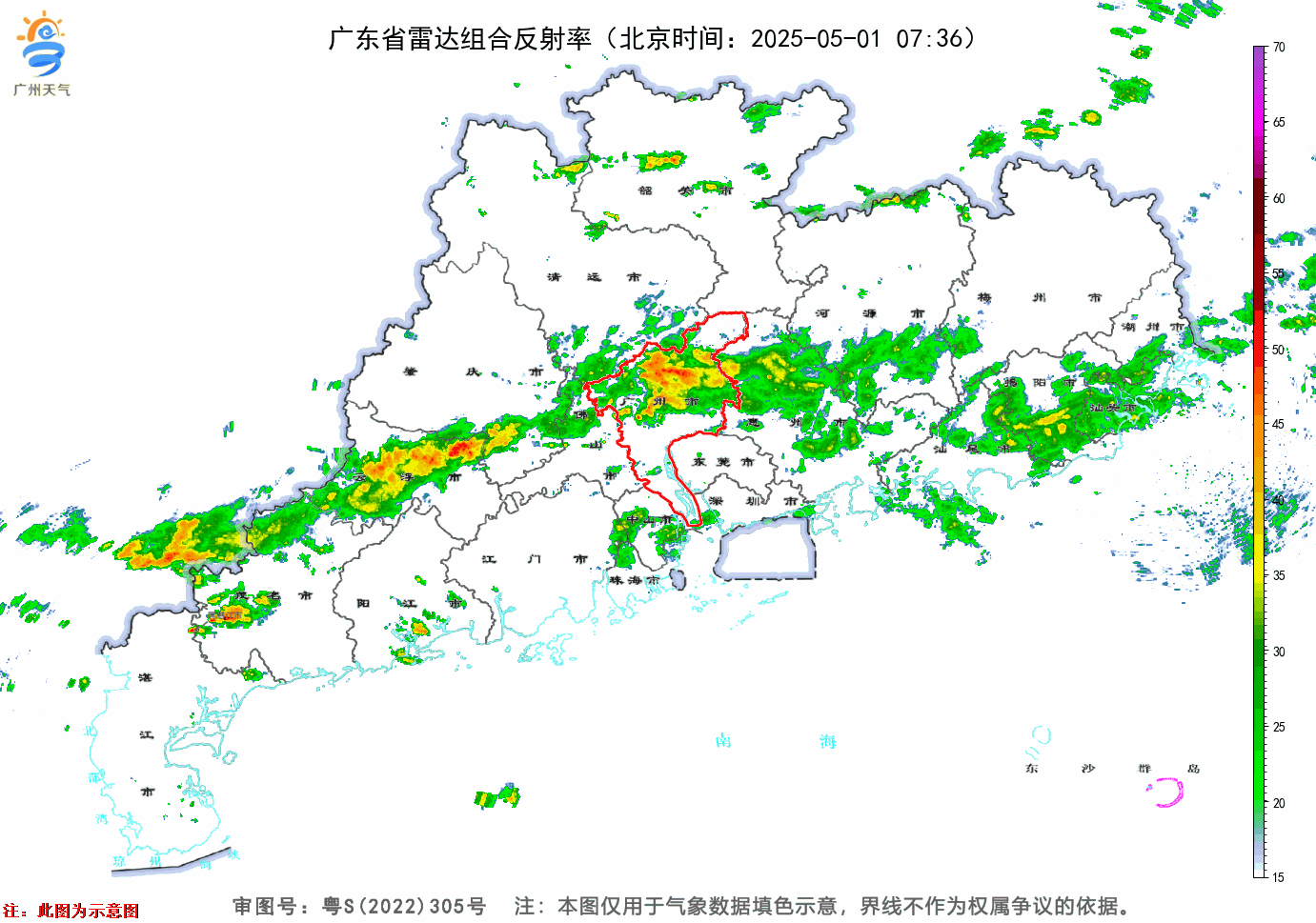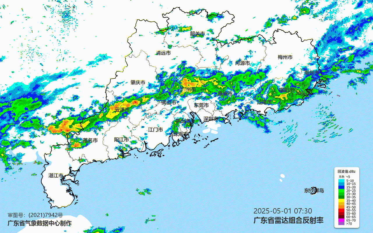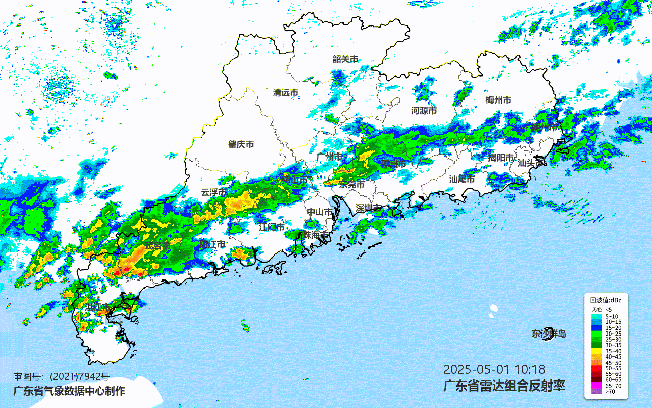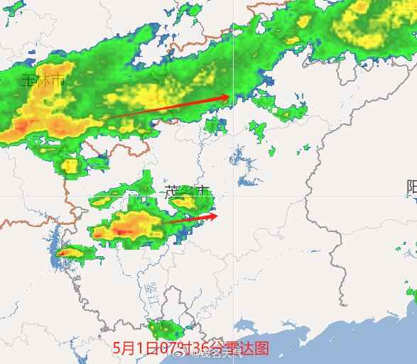5月1日08:27分,雨带自西南向东北移动,现在主要集中在广州、茂名、云浮等地,各位朋友出行时,请注意交通安全,开车要保持安全车距,小心慢行。