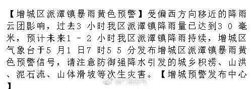 受偏西方向移近的降雨云团影响,过去3小时增城区派潭镇降雨量已达到30毫米,预计未来1-2小时增城区派潭镇降雨持续,增城区气象台于5月1日7时55分发布增城区派潭镇暴雨黄色预警信号。
