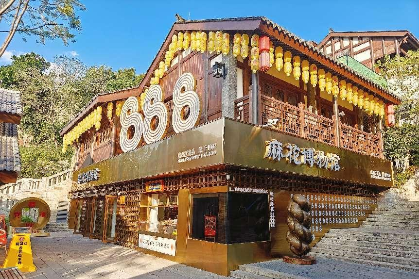 2022年,在磁器口古镇,百年麻花品牌陈昌银主动拥抱时代,将非遗转化为沉浸式体验经济:4米高的弧形墙上,榴莲、巧克力等各种口味的麻花沿墙面延伸至房顶,随处可见“趣味标语”和“超级符号”;“麻花实验室”内,游客可亲手体验揉面、搓条、油炸等传统工艺……