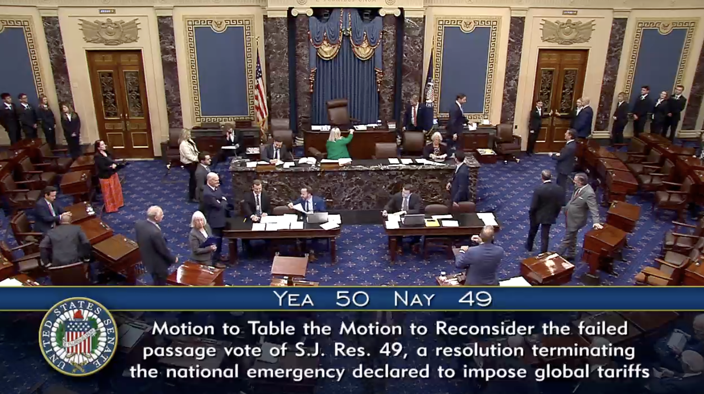 当天稍早前,参议院首先进行了一场有关阻止特朗普对全球多国征收关税的表决,表决结果一度维持49票赞成、49票反对的平票。