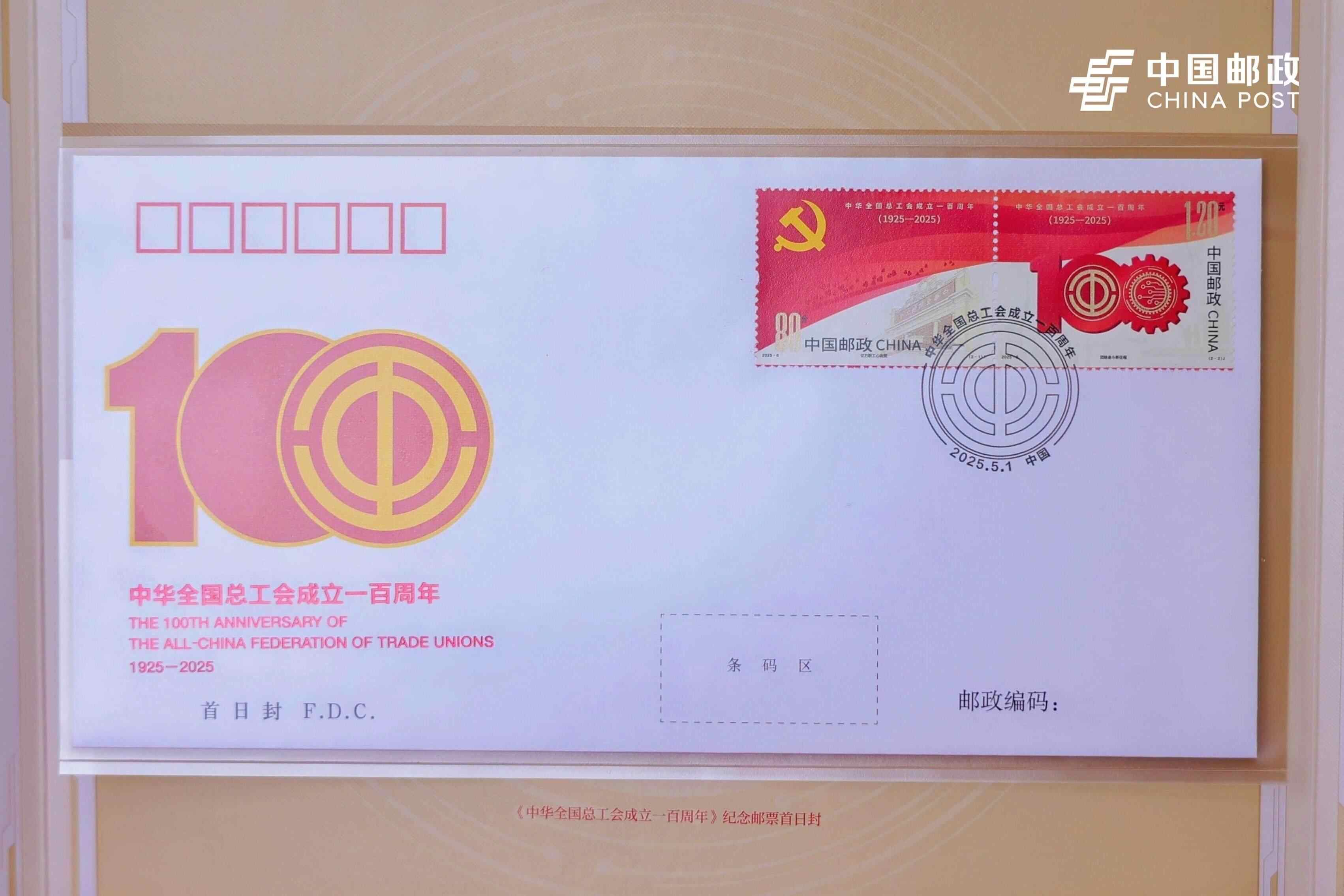 1925年5月1日,中华全国总工会在广州正式成立。本次发行的纪念邮票一套两枚,第一枚图名为“亿万职工心向党”,以党徽、中华全国总工会广州旧址为画面主体,以意象化的红旗为背景,并点缀心形图案,象征中华全国总工会初心向党,在党的领导下走过百年光辉历程。第二枚图名为“团结奋斗新征程”,将中华全国总工会会徽、齿轮、芯片等与数字“100”组合设计,以意象化的红旗为背景,并辅以城市建筑、港口、高铁、飞机、火箭、空间站及劳动者等元素,象征着进入新时代以来,中华全国总工会在党的领导下不断奋进,为实现中华民族伟大复兴作出更大贡献。