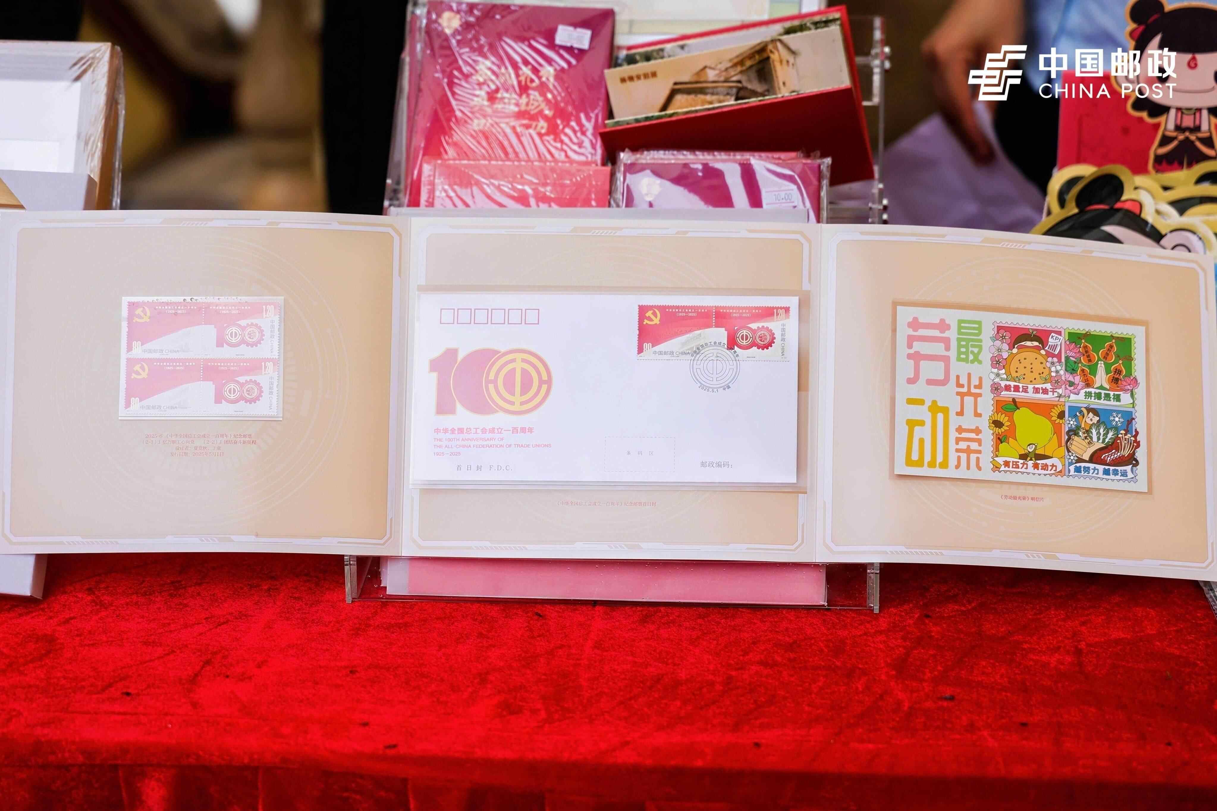此次首发仪式设置临时邮局,现场展售《中华全国总工会成立一百周年》纪念邮票首日封、相关新邮产品以及各类文创产品等。同时,现场提供新邮纪念戳,为广大客户提供免费加盖纪念戳服务。