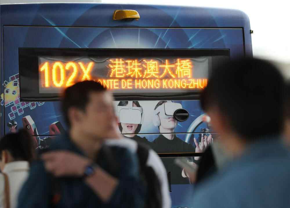 市民和旅客在横琴口岸澳门口岸区排队,准备登上前往港珠澳大桥方向的公交车。新华社记者 王益亮 摄