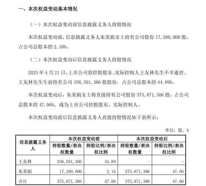 本次权益变动完成后,朱美娟直接持有公司3.76亿股股份,占总股本的47.06%,成为公司控股股东和实际控制人。