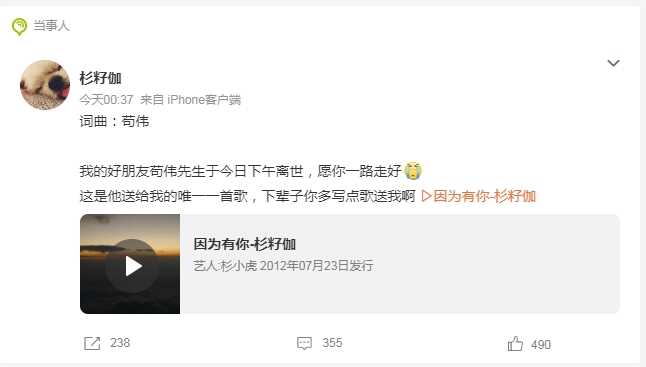 5月7日凌晨,成都歌手杉籽伽发文,称“我的好朋友苟伟先生于今日(6日)下午离世,愿你一路走好”。随后,歌手袁成杰也发文悼念苟伟,称“那个曾经的抱着吉他唱着《海阔天空》的你,那个包着头巾还是满头大汗的你,那个总是嘲笑着自己是个灵活大胖子的你,那个爱唱歌爱音乐爱beyond的你,我会永远记得你,苟伟老大”。