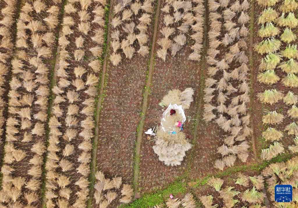 5月2日,在湖南省衡阳市衡东县杨林镇,当地村民在田间拍打油菜荚,分离油菜籽。