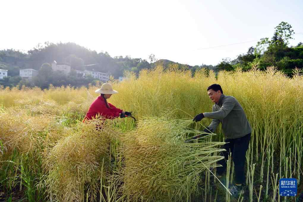 5月1日,湖北省宜昌市秭归县茅坪镇金缸城村村民在田间收获油菜。