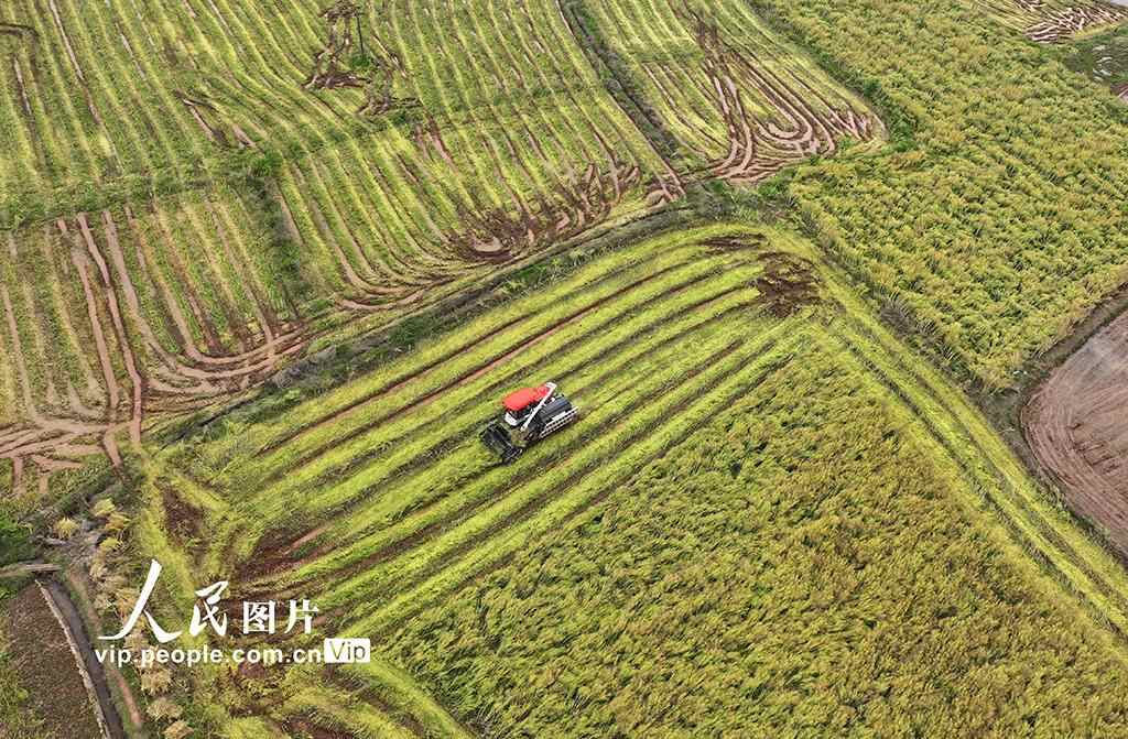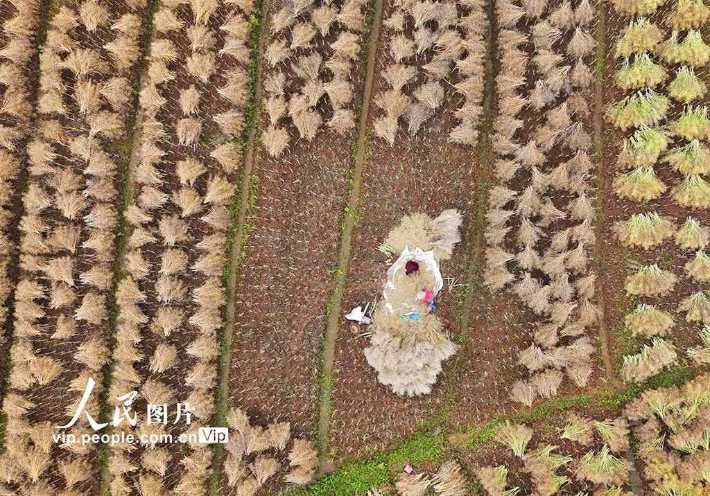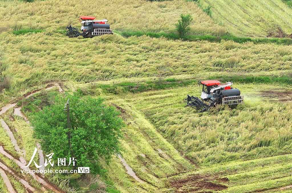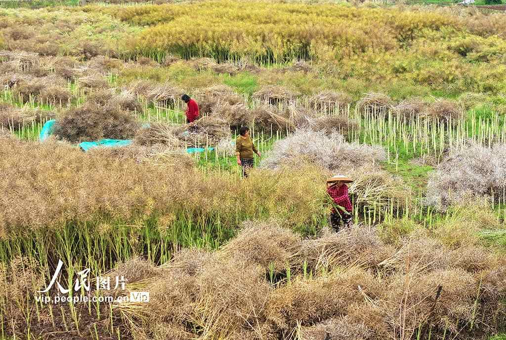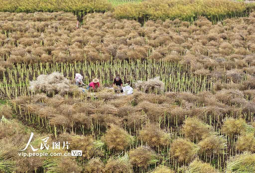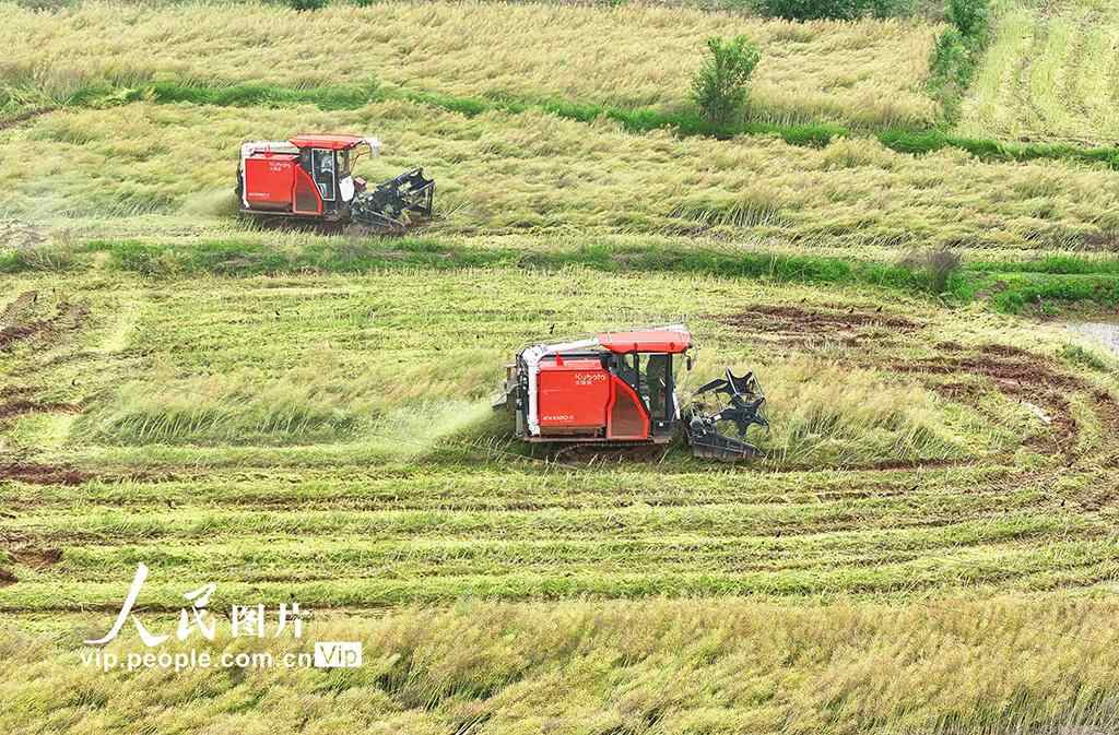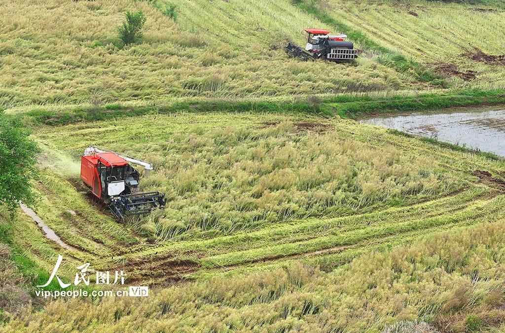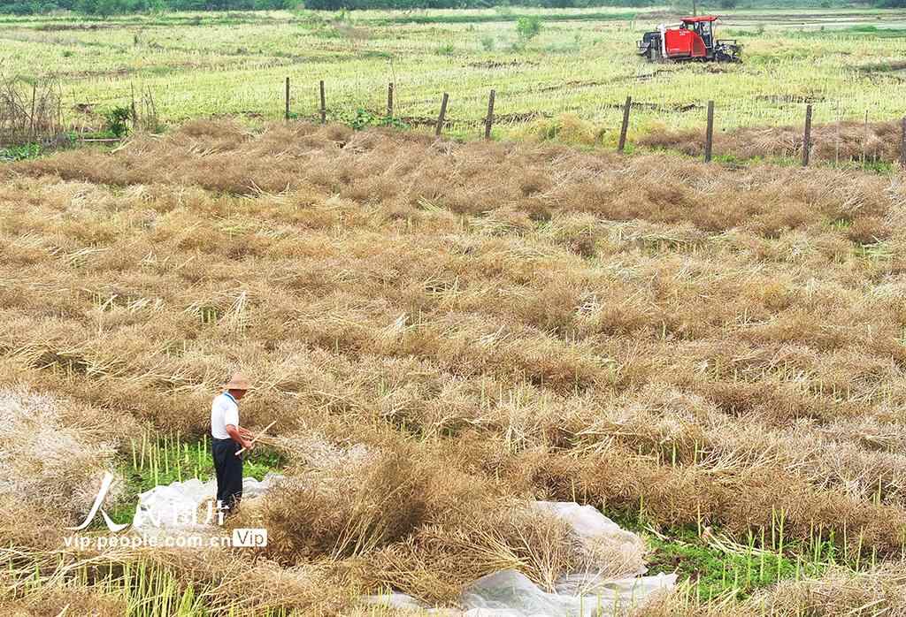 立夏过后,湖南省衡阳市祁东县的油菜籽进入收获季,当地农民抢抓农时收割油菜籽,确保颗粒归仓。曹正平摄(人民图片网)