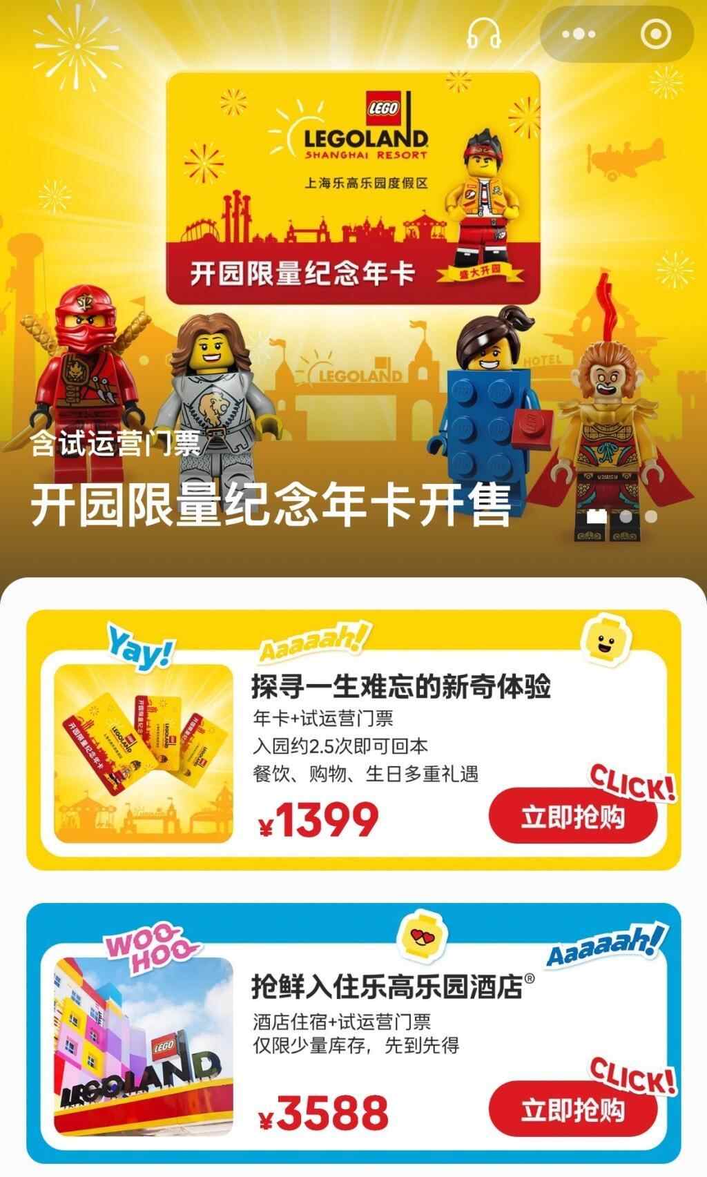 “开园限量纪念年卡(含试运营门票)”及“开园限量酒店套餐(含试运营门票)”今日正式在上海乐高乐园度假区官方微信小程序开售。