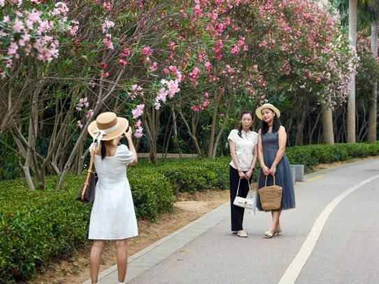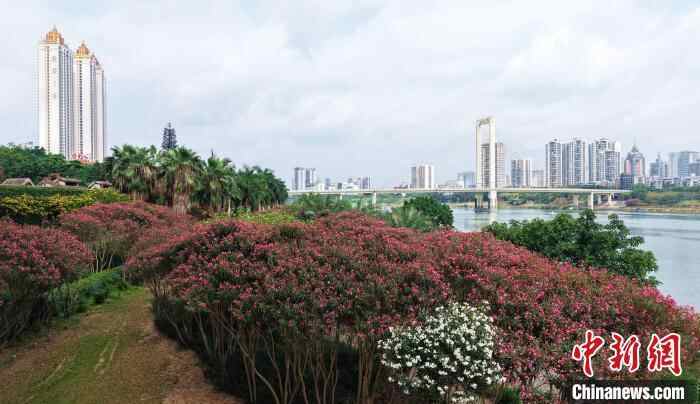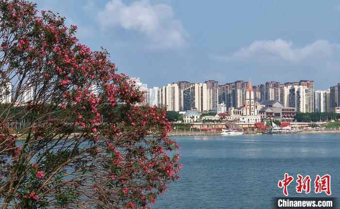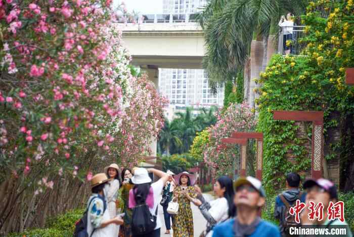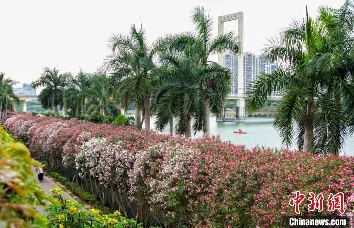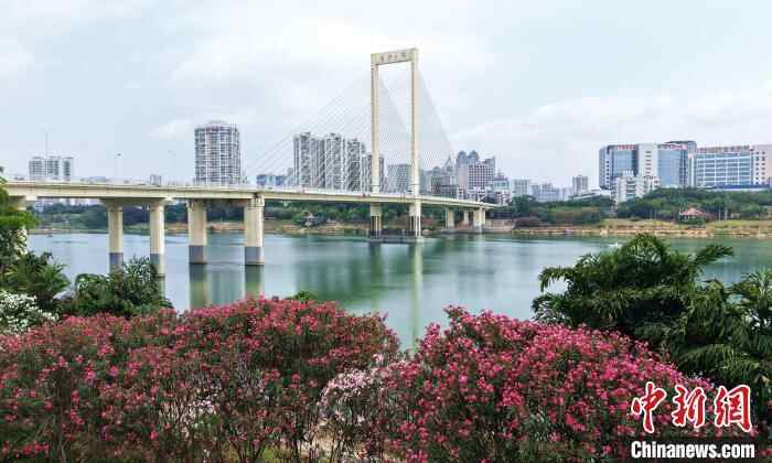 图为盛开的夹竹桃与周围的桥梁、高楼建筑相映成趣。黄云峰 摄