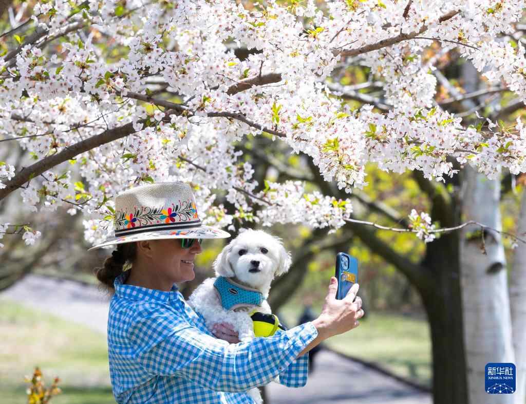 5月6日,一名女子在加拿大多伦多一处公园的樱花树下与宠物狗自拍。