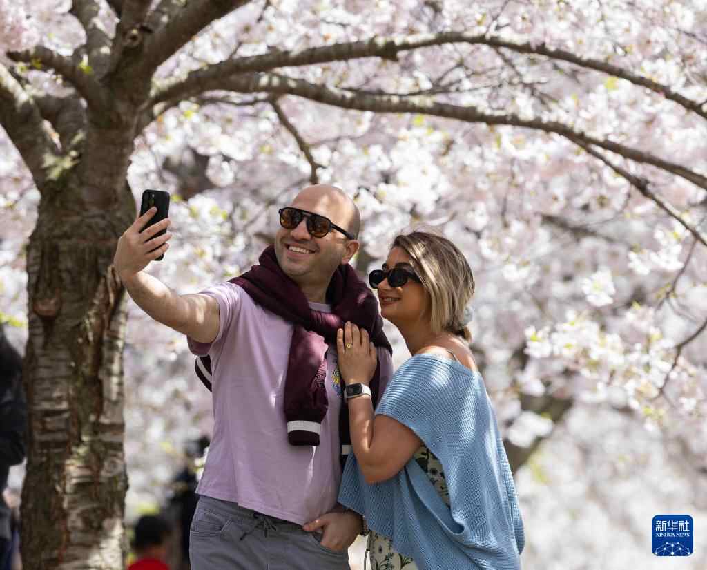 5月6日,人们在加拿大多伦多一处公园的樱花树下自拍。