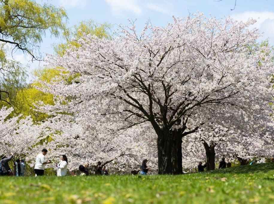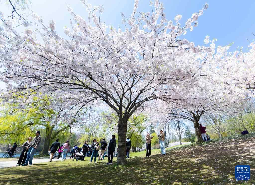 5月6日,人们在加拿大多伦多的一处公园内欣赏盛开的樱花。