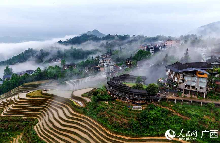 连日来,受连续降雨及温差变化影响,广西桂林市龙胜各族自治县龙脊镇大寨村出现了壮观的云海奇观。清晨时分,晨曦微露,漫无边际的云海铺展在梯田之上,与错落有致的田埂、吊脚楼相映成趣,勾勒出一幅流动的泼墨山水画卷,吸引众多摄影爱好者与游客前来观赏。当地村民也抢抓雨水充沛的时节,抓紧耙田、注水,梯田之上一派忙碌景象。