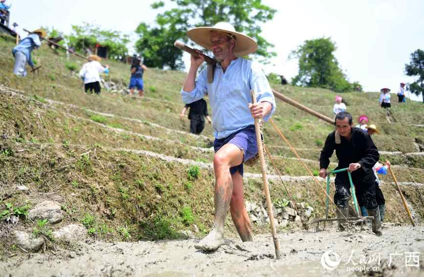 一名外国游客在体验农耕劳作。