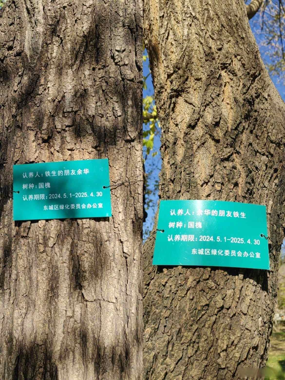 网友发帖显示,两棵国槐树树干上挂着两块牌子,分别写着“认养人:余华的朋友铁生”“认养人:铁生的朋友余华”,认养期限均是从2024年5月1日到2025年4月30日,落款为东城区绿化委员会办公室。该网友开玩笑地表示:“余华老师,该续费了。”帖子发布后,吸引众多网友关注。