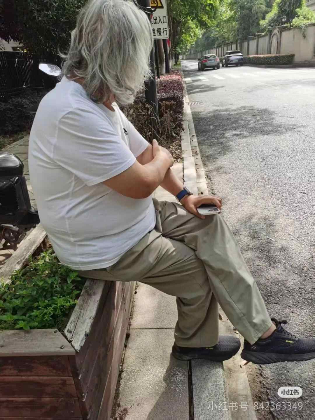 照片中,张纪中满头白发,穿着白色T恤和卡其色裤子,等待交警的过程,他坐在路旁花坛边,凝视着远方,看起来有点郁闷。