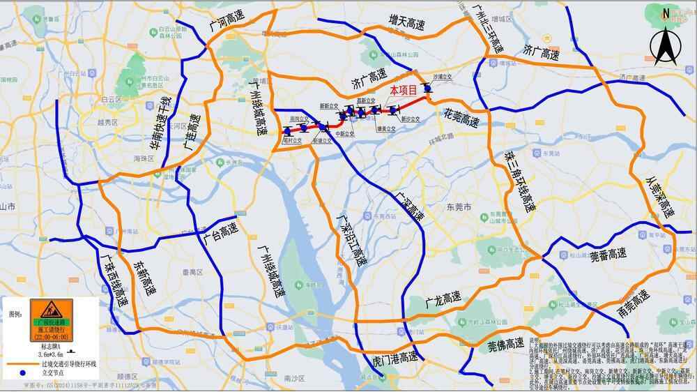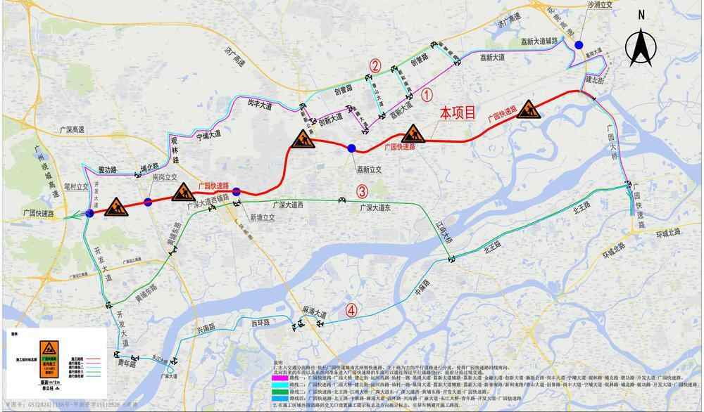 广园快速路(笔村立交至仙村大桥路段)现状为双向六车道,将逐段封闭双向各1-2个车道进行占道施工,具体占道区域将根据实际施工需要确定。作业时间为每天22:00-次日6:00。